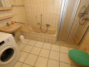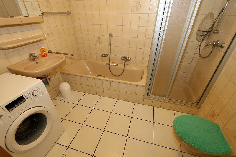 Das Bad hat Dusche, Badewanne mit Haltegriffe, WC und Waschmaschine.