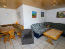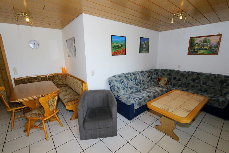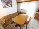 Das Wohnzimmer mit Eckbank und ausziehbarem Tisch und eine Couchecke.