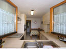 Die moderne Einbauküche hat Essecke, Spülmaschine, Mikrowelle Toaster Elektrogrill und Kaffeemaschine.